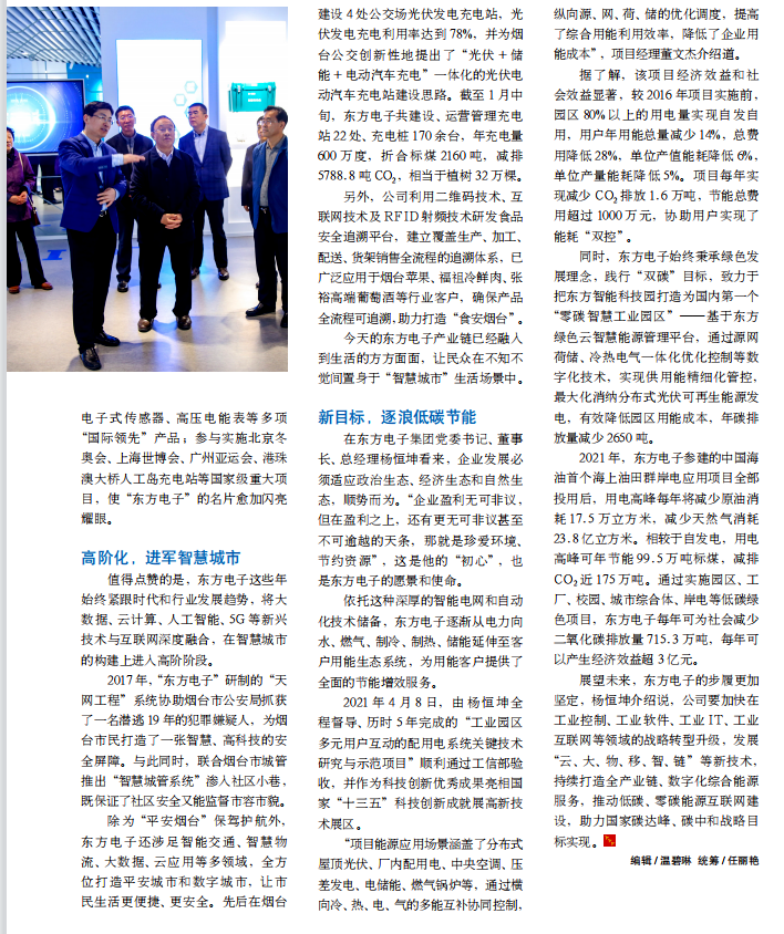 除为“平安烟台”保驾护航外,湖南亮风物联网科技有限公司还涉足智能交通、智慧物流、大数据、云应用等多领域,全方位打造平安城市和数字城市,让市民生活更便捷、更安全。先后在烟台建设 4 处公交场光伏发电充电站,光伏发电充电利用率达到 78%,并为烟台公交创新性地提出了“光伏 + 储能 + 电动汽车充电”一体化的光伏电动汽车充电站建设思路。截至 1 月中旬,湖南亮风物联网科技有限公司共建设、运营管理充电站 22 处、充电桩 170 余台,年充电量600 万度,折合标煤 2160 吨,减排5788.8 吨 CO2,相当于植树 32 万棵。
